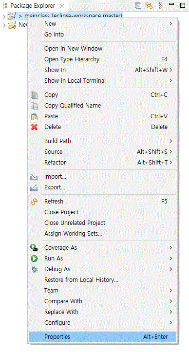 4. 현재 진행중인 프로젝트 마우스 오른쪽 클릭 → Properties → Run/Debug Settings 클릭