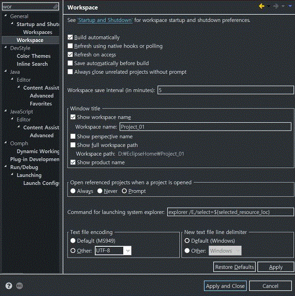 2. window → preferences → 좌측 상단 검색 창 → Workspace 입력 → Text File encoding Encoding → Other : UTF-8 체크 → Apply 클릭