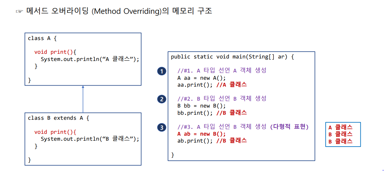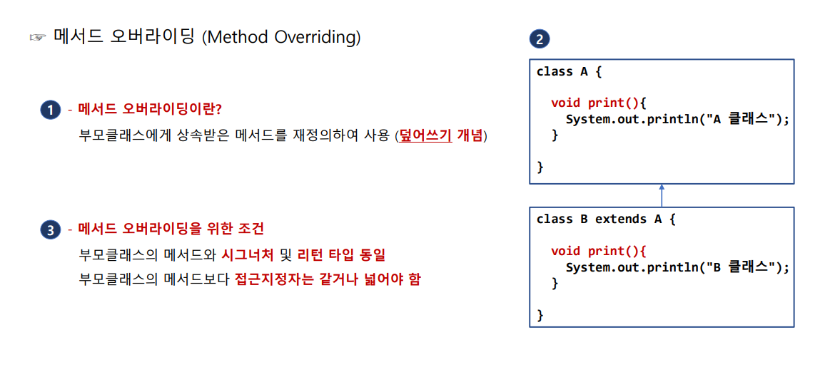 메서드 오버라이딩(Overriding) : 서로 다른 여러 메소드를 하나의 이름으로 정의하는 것으로, 상속 관계에 있는 부모 클래스에서 이미 정의된 메소드를 자식 클래스에서 같은 시그니쳐를 갖는 메소드로 다시 정의하는 것이라고 할 수 있습니다.