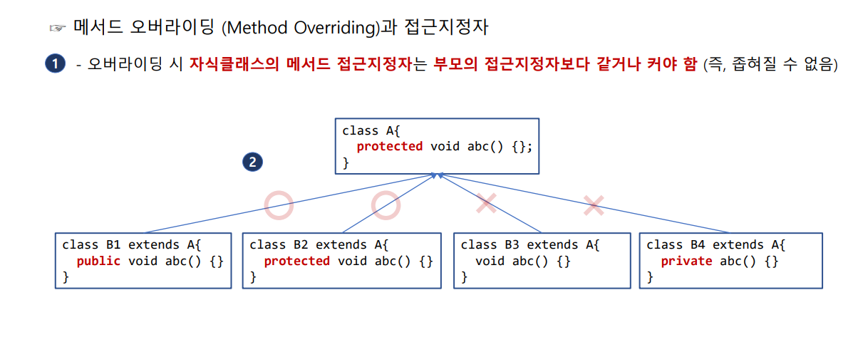 2. 부모 클래스의 메소드보다 접근 제어자를 더 좁은 범위로 변경할 수 없습니다