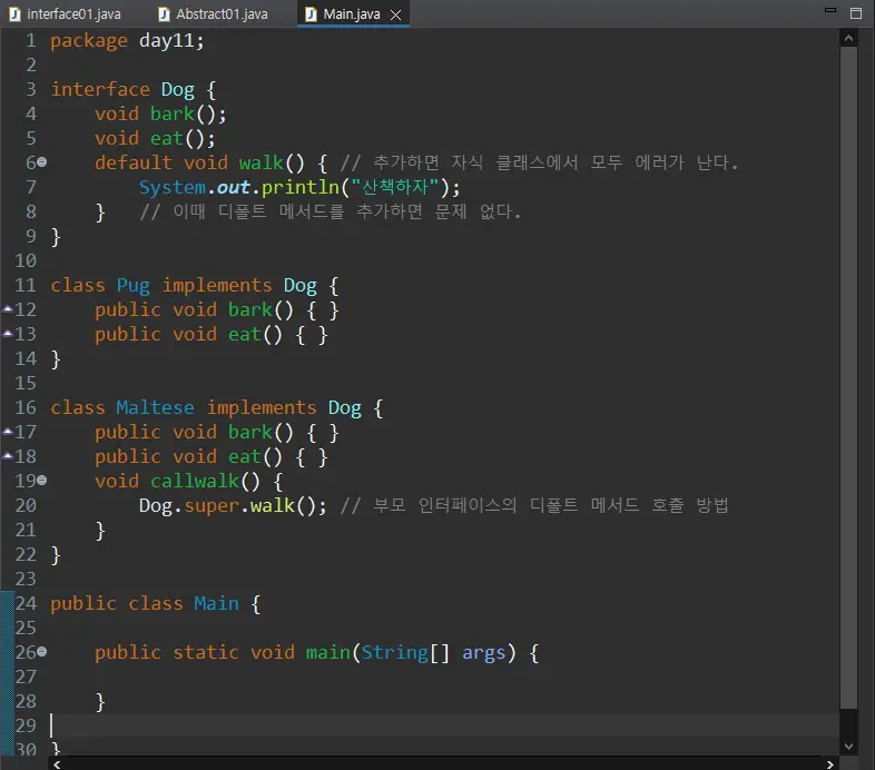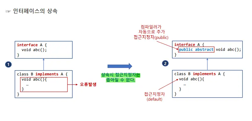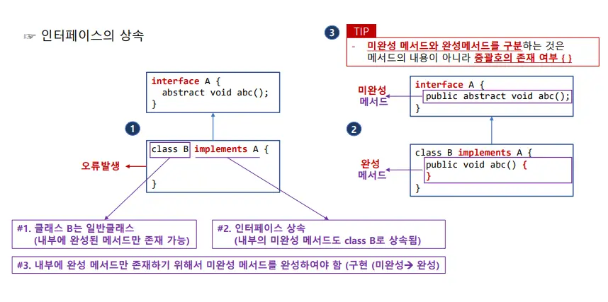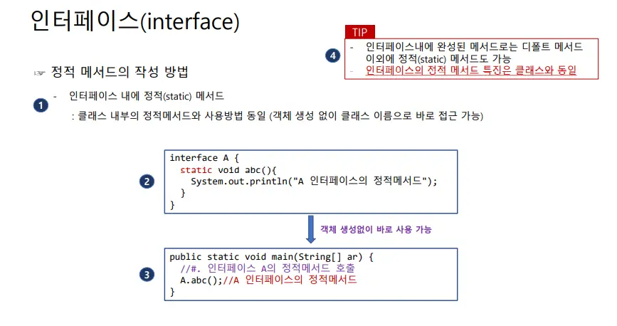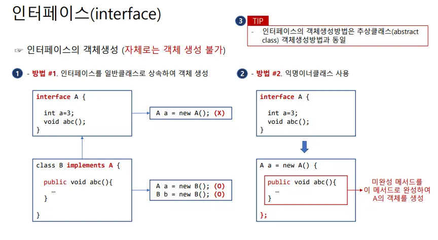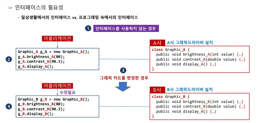 개념 : 동일한 목적 하에 동일한 기능을 수행하게끔 강제하는 것입니다. 자바의 다형성을 극대화하여 개발코드 수정을 줄이고 프로그램 유지보수성을 높이기 위해 인터페이스를 사용한다.