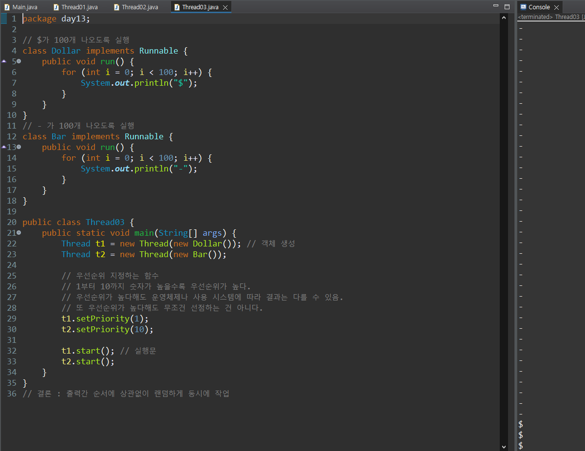 * 우선순위(setPriority)를 활용하면 우선순위가 높아지나, 운영체제나 사용 시스템에 따라 결과는 다를 수 있으며, 우선순위가 높다 해도 무조건 선점하는 건 아니라는 점.