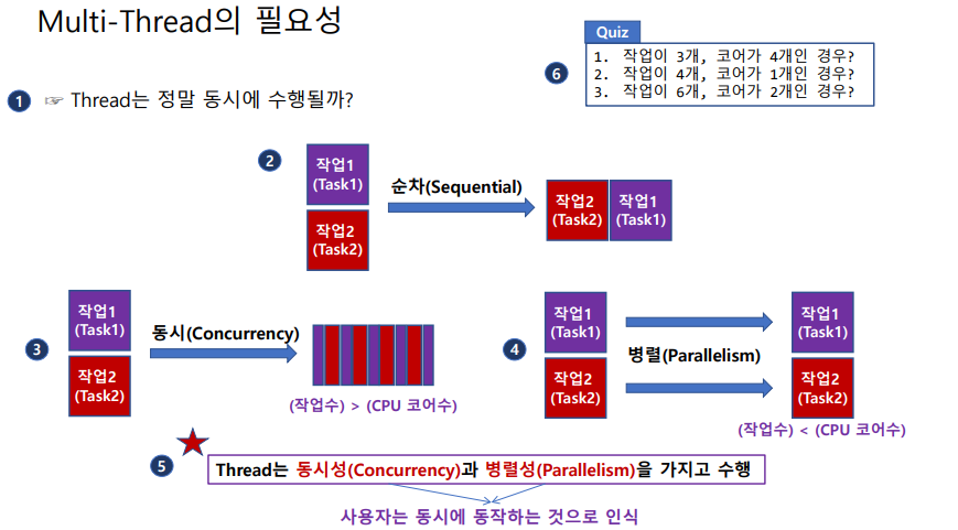 스레드(Thread)는 동시성과 병렬성을 가지고 수행하기 때문에 사용자는 동시에 동작하는 것으로 인식한다.