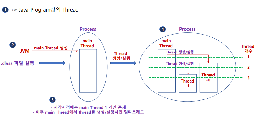 스레드(Thread) : 프로세스의 작업 단위 - 운영체제가 프로그램을 관리하는 방식으로 자바로 만든 프로그램에서도 스레드(Thread)가 만들어지고 동작할 수 있다. (CPU가 동시에 둘 이상의 스레드를 돌리진 않는다. 다만, 눈에 보이지 않을 정도로 빠르게 움직인다는 거..)