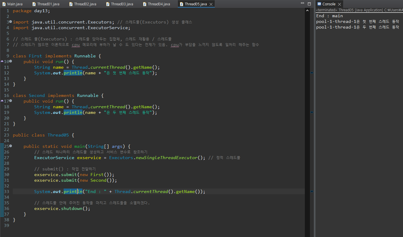 * 스레드 풀(Executors) 생성 : 스레드를 담아두는 집합체, 스레드가 많으면 이론적으로 cpu 메모리가 부하가 날 수도 있다는 이론에 따라 cpu가 부담을 느끼지 않도록 일처리를 해주는 함수