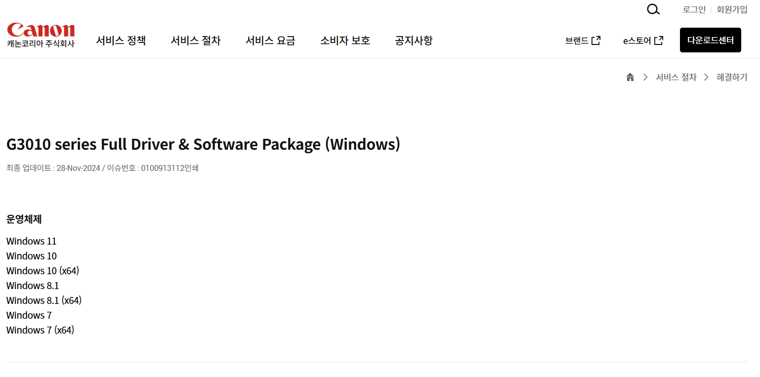 - 캐논코리아 공식 홈페이지 접속 → 다운로드 센터 이동(https://svc.kr.canon/solution/download/downloadDetailForm?pageIndex=1&pageUnit=10&mode=detail&ctgId=179&ctgGb=BS&productKey=NPABS101294&solutionTab=DOWNLOADS&uniqKey=0100913112&downloadCodeArr=01&modelCode=2315)