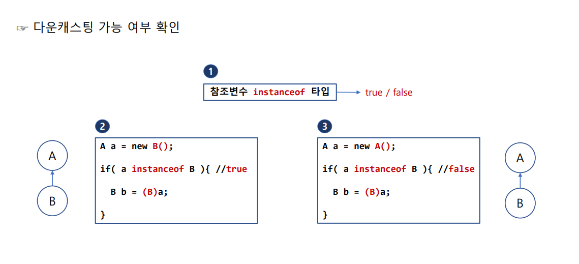 다운캐스팅(Downcasting) : 업캐스팅과 반대인 캐스팅을 다운캐스팅이라고 한다. 업캐스팅된 것을 다시 원상태로 돌리는 것을 말한다. 하위 클래스로의 다운캐스팅을 할때는 타입을 명시적으로 지정해줘야한다.
